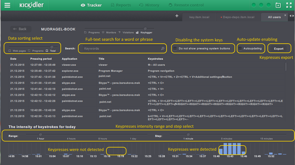 Çalışanlar tarafından görevlerin yerine getirilmesinin izlenmesinin kolaylığı için, mevcut gün için tuş vuruşlarının yoğunluğunun bir grafik şeklinde gösterilir.
