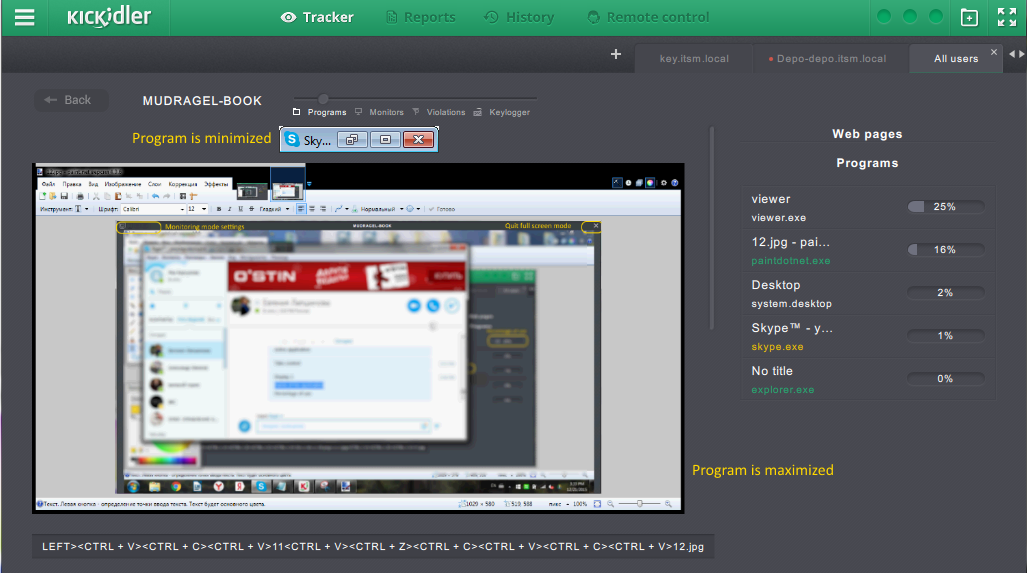 Çalışan programları izlemeye gitmek için "Programlar" düğmesine tıklayın. Çalışanın bilgisayarında çalışan tüm programların pencerelerinin görüntülendiği izleme bölümüne yönlendirilirsiniz. Program penceresi küçültülebilir veya büyütülebilir. Tüm programlar aşağı kaydırılabilir. Sağda çalışan bir uygulama paneli var. Aşağıda çalışanların çevrimiçi tuş vuruşlarını içeren, kayan bir çizgi vardır.