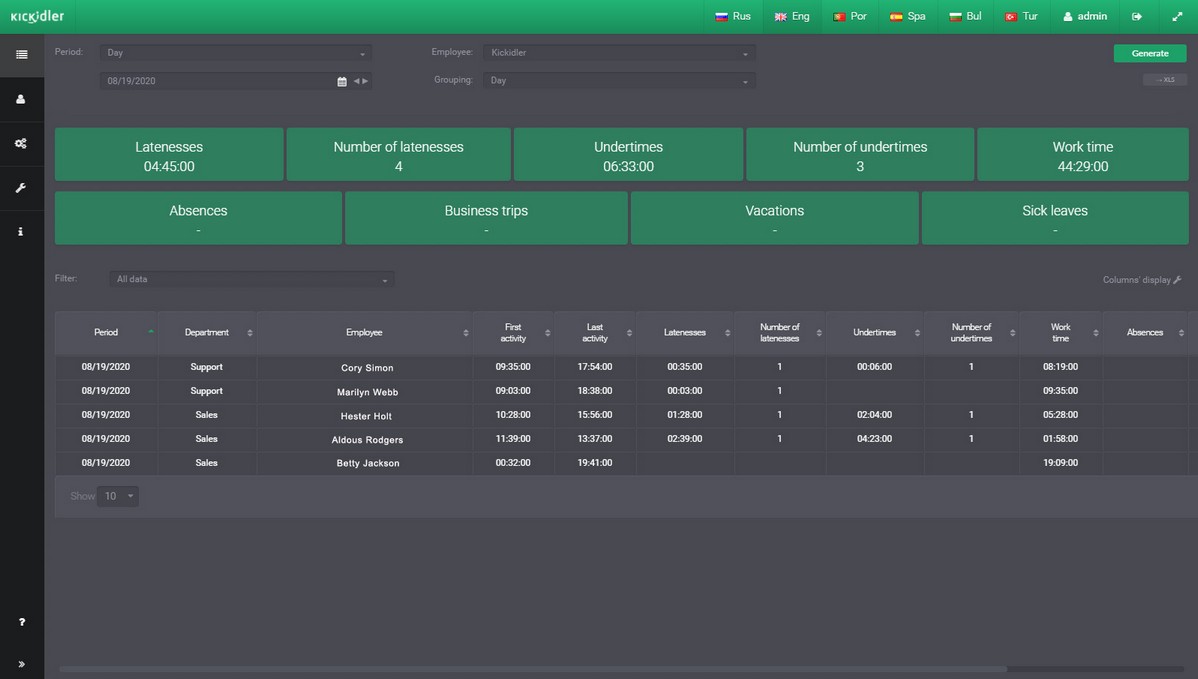 Програмният продукт Kickidler за мониторинг на работното време, предлага инструмент за мониторинг на времето, който позволява да се наблюдава работното време на служителите, или цели отдели. Работа извънреден труд, закъснение, ранни отпуски, отсъствия, кафе паузи или паузи пушене, излизане на разходка в средата на работния ден и други разсейвания от работните задължения автоматично се записват в доклади и графиците за работното време. Тези данни се визуализират под формата на графики и диаграми.