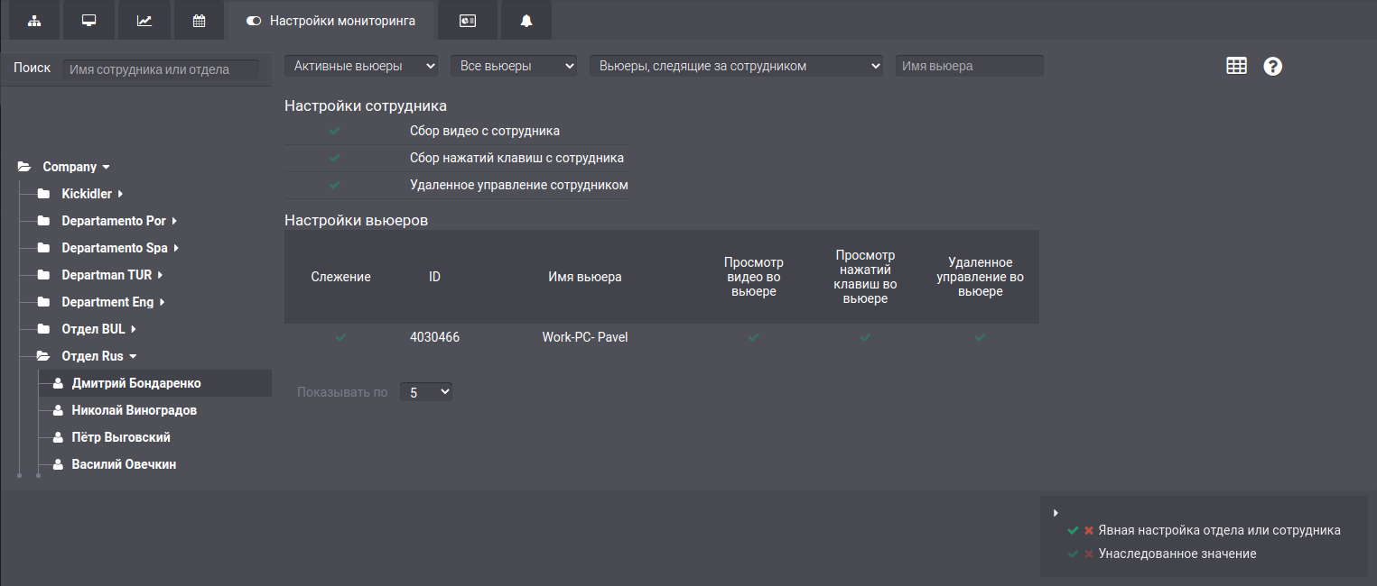 Настройка вьюера, которая разрешает или запрещает вьюеру осуществлять мониторинг за сотрудником или отделом.